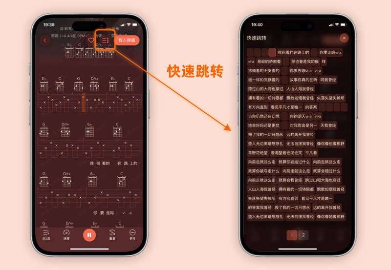 - 点击顶部的「快速跳转」图标按钮,会弹出整首歌的歌词段落,点击歌词可以快速跳转到对应小节。
